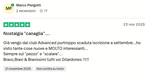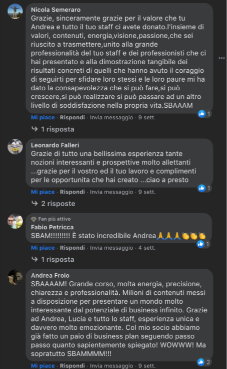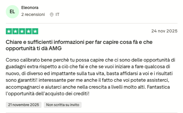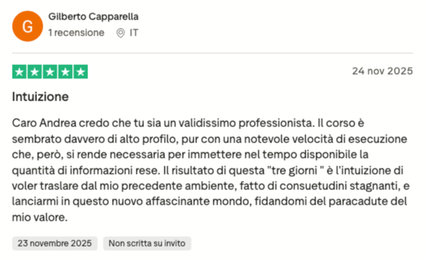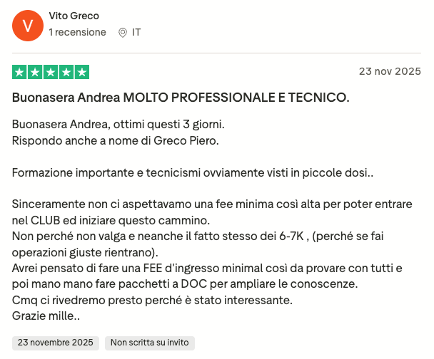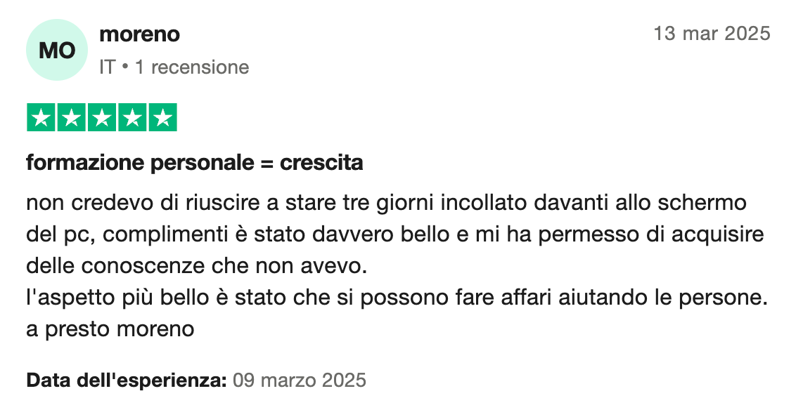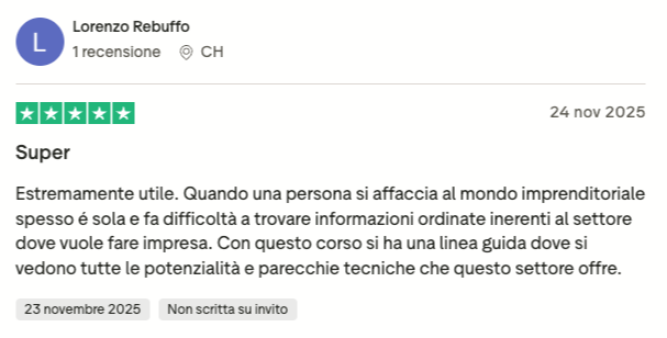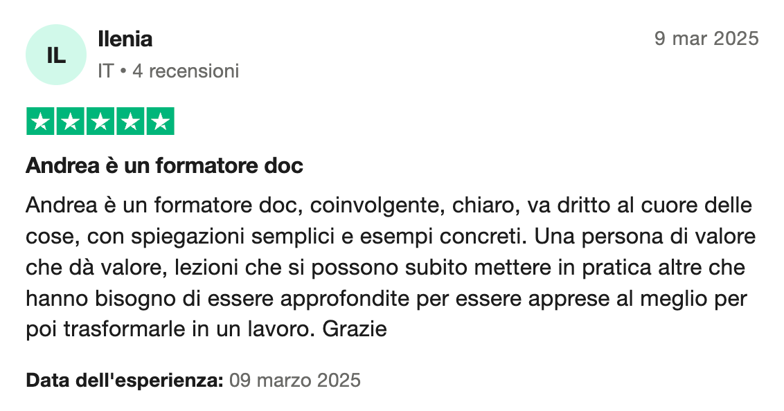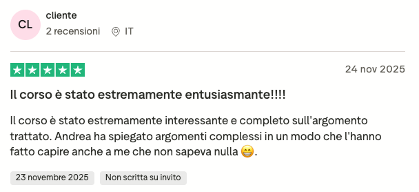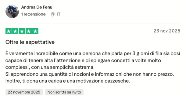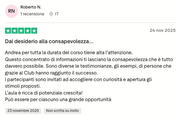 Il contenuto di questa pagina e dei nostri corsi è inteso esclusivamente a scopo formativo e informativo. Non deve essere considerato una promessa o garanzia di risultati specifici. Il raggiungimento di eventuali obiettivi dipende dall’impegno, dall’applicazione costante e dalla capacità di mettere in pratica le conoscenze apprese. La maggior parte delle persone che acquistano corsi di formazione non ottiene risultati significativi a causa di una mancata applicazione o perdita di motivazione.